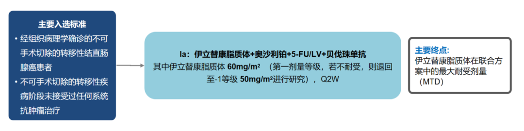 研究設(shè)計(jì):這是一項(xiàng)多中心的I期臨床試驗(yàn),由復(fù)旦大學(xué)附屬中山醫(yī)院的劉天舒主任牽頭,納入既往未接受過(guò)轉(zhuǎn)移性疾病系統(tǒng)性治療的結(jié)直腸癌患者。研究Ia階段為伊立替康脂質(zhì)體的劑量遞增研究,患者接受伊立替康脂質(zhì)體聯(lián)合奧沙利鉑、5-FU/LV和貝伐珠單抗方案治療。