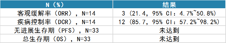 研究結(jié)果:截止2024年6月14日,共入組33例受試者。有14例受試者接受過(guò)至少一次影像學(xué)評(píng)估。所有患者中位隨訪時(shí)間51.0天(范圍:1.0-115.0天),3例受試者疾病進(jìn)展,主要療效結(jié)果見(jiàn)表1。