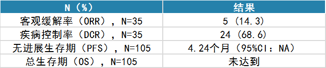研究結(jié)果:自2023年10月11日至2024年6月13日,隊(duì)列二共入組105例受試者。入組的受試者中,最常使用的治療方案為Nal-IRI+氟尿嘧啶類(53/105,50.5%)和Nal-IRI+奧沙利鉑+氟尿嘧啶類(23/105,21.9%)。有35例患者接受過(guò)至少一次影像學(xué)評(píng)估,15例受試者出現(xiàn)疾病進(jìn)展或死亡,中位隨訪時(shí)間為1.31個(gè)月。主要療效結(jié)果見(jiàn)表2。