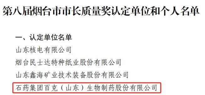 石藥集團(tuán)百克公司榮獲煙臺(tái)市市長(zhǎng)質(zhì)量獎(jiǎng)
