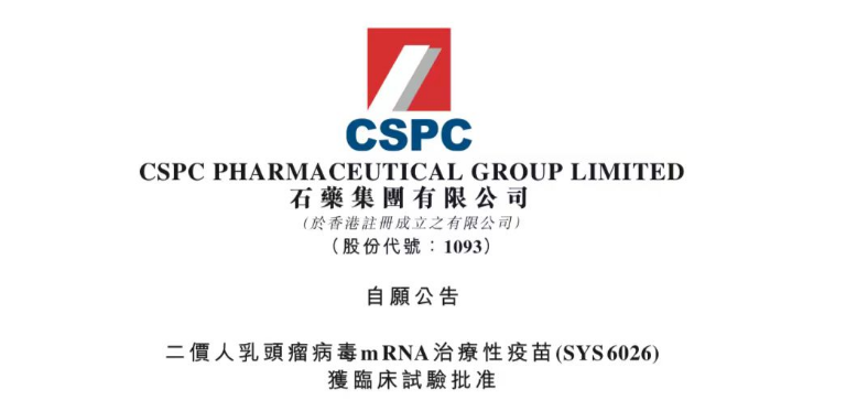 11月12日,石藥集團(tuán)(01093.HK)發(fā)布公告,集團(tuán)開(kāi)發(fā)的針對(duì)人乳頭瘤病毒(HPV)16或18型所引起的相關(guān)癌前病變的治療性二價(jià)信使RNA(mRNA)疫苗SYS6026(該產(chǎn)品)已獲中華人民共和國(guó)國(guó)家藥品監(jiān)督管理局批準(zhǔn),可以在中國(guó)開(kāi)展臨床試驗(yàn)。
