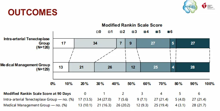 在反橋接治療方面,ANGEL-TNK旨在研究發(fā)病4.5-24h的急性前循環(huán)大血管閉塞患者,機(jī)械取栓再通后,動(dòng)脈內(nèi)注射替奈普酶溶栓的療效和安全性。研究由首都醫(yī)科大學(xué)附屬北京天壇醫(yī)院繆中榮教授團(tuán)隊(duì)主導(dǎo),該研究納入256例受試者,主要終點(diǎn)為90天mRS評(píng)分0-1分的患者比例。