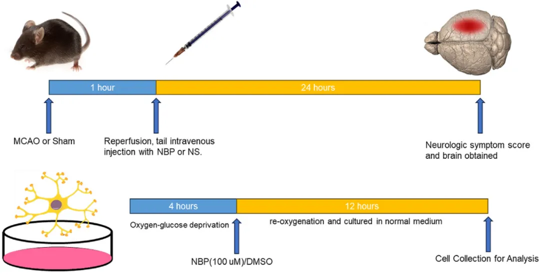 體內(nèi)實驗中,通過閉塞大腦中動脈1小時后再灌注,構(gòu)建小鼠腦缺血再灌注模型。再灌注的同時靜脈注射NBP或生理鹽水,24小時后評估包括神經(jīng)系統(tǒng)評分和代謝物改變在內(nèi)的藥效指標(biāo)。體外實驗中,運用HT22小鼠神經(jīng)元細(xì)胞系構(gòu)建缺氧復(fù)氧細(xì)胞模型評估NBP的療效,具體如圖1所示。