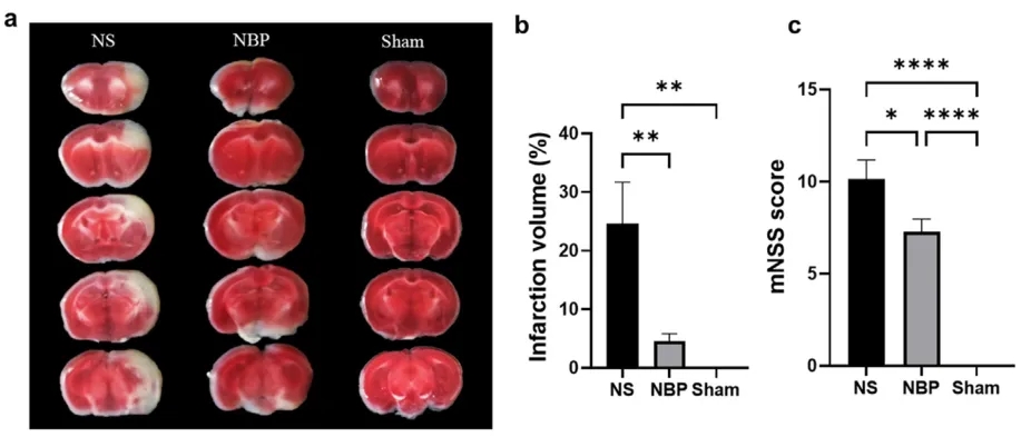 TTC染色顯示,與生理鹽水(NS)組相比,NBP治療組的梗死面積顯著減少(圖2a和b)。此外,NBP組也表現(xiàn)出較輕的神經(jīng)功能缺損癥狀(圖2c)。這些結(jié)果表明,NBP對腦缺血再灌注損傷模型的神經(jīng)功能具有良好的保護作用。