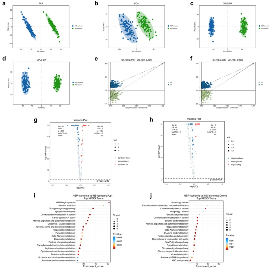 運用空間代謝組學(xué)(SM)研究NBP對代謝物譜的影響。主成分分析(PCA)揭示了兩組之間不同的代謝物模式(圖3a和b),正交偏最小二乘法判別分析(OPLS-DA)顯示了聚類和分組差異(圖3c和d)。置換測試通過7倍交叉驗證和200個響應(yīng)來評估模型的質(zhì)量,表明兩組結(jié)果沒有過擬合(圖3e和f)。在負(fù)電離模式下鑒定出481種代謝物,在正電離模式下鑒別出295種代謝物。在負(fù)離子模式下,有18種上調(diào)的代謝物和42種下調(diào)的代謝物,在正離子模式下有13種上調(diào)的代謝產(chǎn)物和24種下調(diào)的代謝產(chǎn)物(圖3g和h)。隨后的分類和通路富集分析揭示了NBP影響的關(guān)鍵代謝通路(圖3i和j)。