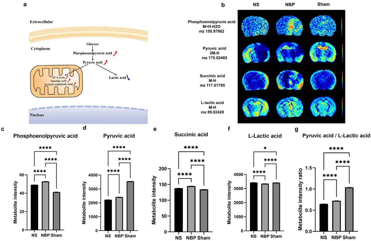 大腦極易發(fā)生局部缺血,盡管只占其體重的2%,但消耗了人體約20-25%的氧氣和葡萄糖。不間斷的能量供應(yīng)對腦組織功能至關(guān)重要,外源性(如氧氣和葡萄糖)或內(nèi)源性(如線粒體功能障礙)因素造成的中斷均可能導(dǎo)致不可逆的損傷。KEGG通路富集分析表明,NBP上調(diào)了與丙酮酸代謝和檸檬酸循環(huán)相關(guān)的通路,這兩者都是能量供應(yīng)所必需的(圖3i)。圖4a顯示了詳細(xì)的能量供應(yīng)機制的示意圖。NBP組能量相關(guān)代謝物的水平,包括磷酸烯醇丙酮酸、丙酮酸和琥珀酸,顯著上調(diào),而乳酸水平顯著下調(diào)(圖4b-f)。這些發(fā)現(xiàn)表明NBP組的線粒體有氧呼吸能量供應(yīng)系統(tǒng)顯著增強。此外,丙酮酸與L-乳酸比例的增加(圖4g)同樣表明NBP組的線粒體功能增強,綜上結(jié)果顯示線粒體是NBP的潛在靶點。
