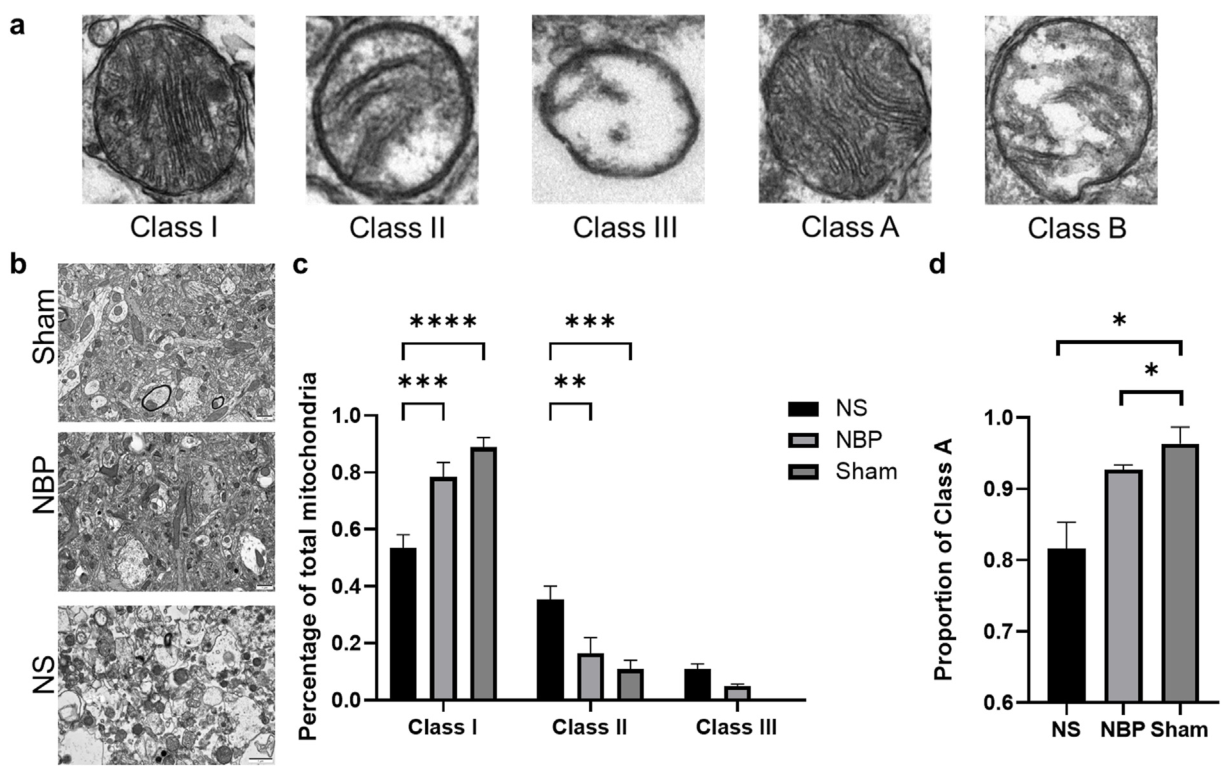 空間代謝組學(xué)的結(jié)果表明線粒體可能是NBP的靶點。為了進(jìn)一步驗證這一假設(shè),研究人員分析了線粒體的形態(tài)變化,包括線粒體嵴數(shù)、基質(zhì)密度和腫脹。從形態(tài)學(xué)的角度來看,每個線粒體的嵴數(shù)量增加和基質(zhì)密度增加表明線粒體功能狀態(tài)得到改善。線粒體嵴、基質(zhì)密度和腫脹的分類如圖5a所示。分析結(jié)果顯示,NBP對于線粒體嵴、基質(zhì)密度和腫脹表現(xiàn)出不同程度的改善作用(圖5b, c和d)。