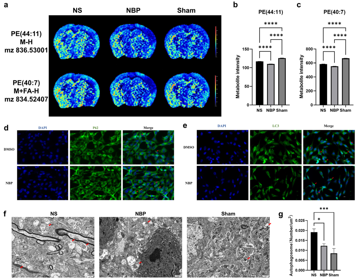自噬是一種細(xì)胞機制,可以隔離受損/老化的細(xì)胞器、多余的蛋白質(zhì)和細(xì)胞成分,因其在多種疾病中的潛在致病作用而受到廣泛關(guān)注。有研究表明磷脂酰乙醇胺(PE)是自噬的關(guān)鍵調(diào)節(jié)因子。在該研究中,代謝物分析顯示了自噬途徑的顯著下調(diào),如PE水平降低所示(圖3j和6a),并通過定量分析驗證了這些發(fā)現(xiàn)(圖6b和c),表明抑制自噬可能是NBP的作用機制之一。在缺氧復(fù)氧細(xì)胞模型中,NBP組細(xì)胞的LC3表達(dá)降低,p62表達(dá)升高,表明NBP對于細(xì)胞自噬具有潛在的抑制作用(圖6d和e)。此外,透射電子顯微鏡(TEM)的結(jié)果也顯示了NBP處理后的神經(jīng)元細(xì)胞中的自噬體的減少(圖6f和g)。綜上所述,這些結(jié)果表明NBP可能通過抑制細(xì)胞自噬發(fā)揮神經(jīng)保護作用。