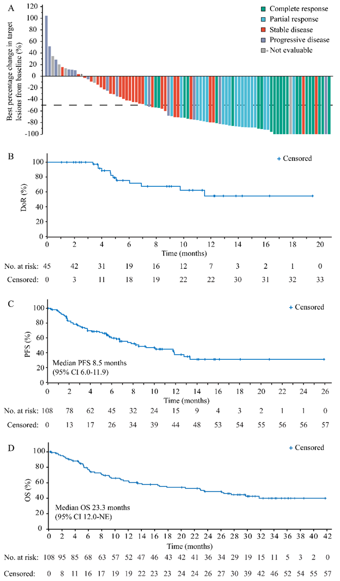 根據(jù)獨立評審委員會(IRC)評估結(jié)果,最佳療效達完全緩解(CR)的有25例,部分緩解(PR)的有20例,經(jīng)確認的客觀緩解率(ORR)為41.7%(45/108,95% CI:32.3-51.5%),經(jīng)確認的CR率為23.1%;研究者評估的ORR為46.3%(15 例 CR + 35 例 PR,50/108,95% 置信區(qū)間:36.7-56.2%),經(jīng)確認的CR率為13.9%。如瀑布圖所示(圖A),依據(jù)IRC評估,86.5%的患者治療后靶病灶腫瘤體積呈現(xiàn)縮小態(tài)勢。中位隨訪時長為29.5個月,中位緩解持續(xù)時間(DoR)尚未達到(圖B)。經(jīng)IRC評估,達客觀緩解的共45例,其中84%(38/45)的受試者客觀緩解維持3個月以上。中位無進展生存期(PFS)為8.5個月(95% CI:6.0 - 11.9)(圖C),中位總生存期(OS)為23.3個月(95% CI:12.0 - 未達到)(圖D)。