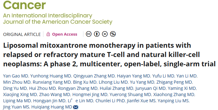 近期,中山大學腫瘤防治中心黃慧強教授作為通訊作者于《Cancer》雜志發(fā)表文章《米托蒽醌脂質(zhì)體單藥治療復發(fā)或難治性成熟T細胞和NK細胞腫瘤患者:一項2期、多中心、開放、單臂試驗》。
