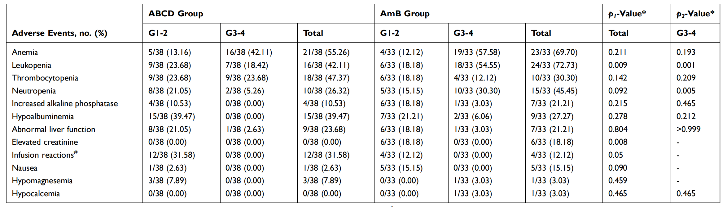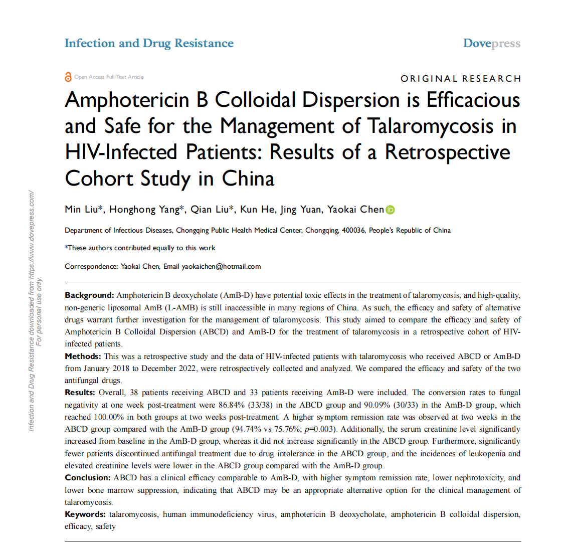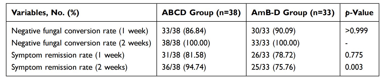 近期,《Infection and Drug Resistance》(2024,IF2.9,DOI: 10.2147/IDR.S481856)發(fā)表了一項(xiàng)由重慶市公共衛(wèi)生醫(yī)療救治中心感染科陳耀凱教授牽頭開展的,既往接受過ABCD或AmB-D治療的HIV陽性馬爾尼菲藍(lán)狀菌病回顧性研究的結(jié)果,旨在比較ABCD和AmB-D在HIV陽性馬爾尼菲藍(lán)狀菌病患者的療效和安全性。一項(xiàng)回顧性研究,研究對(duì)象為2018年1月至2022年12月期間接受過ABCD或AmB-D治療的HIV陽性馬爾尼菲藍(lán)狀菌病的患者。通過收集其相關(guān)病例資料,比較了兩種抗真菌藥物的療效和安全性。共納入38例接受ABCD治療的患者、33例接受AmB-D治療的患者。ABCD組治療一周后的真菌陰轉(zhuǎn)率為86.84%(33/38),AmB-D組為90.09%(30/33),兩組在治療后兩周后真菌轉(zhuǎn)陰率均達(dá)到100.00%。與AmB-D組相比,ABCD組在兩周時(shí)的癥狀緩解率更高(94.74% vs 75.76%; P=0.003)。此外,AmB-D組血清肌酐水平較基線顯著升高,而ABCD組無顯著升高。并且,與AmB-D組相比,ABCD組因藥物不耐受而停止抗真菌治療的患者明顯減少,白細(xì)胞降低和肌酐水平升高的發(fā)生率更低。ABCD的臨床療效與AmB-D相當(dāng),具有更高的癥狀緩解率,更低的腎毒性和更低的骨髓抑制,提示ABCD可能是臨床治療馬爾尼菲藍(lán)狀菌病的合適的替代選擇。