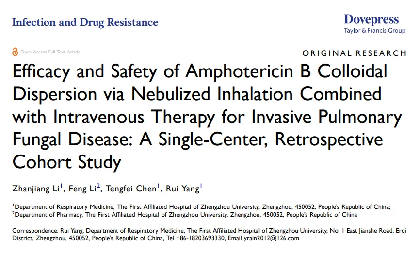 近期,Infection and Drug Resistance?發(fā)表了一項(xiàng)由鄭州大學(xué)第一附屬醫(yī)院呼吸內(nèi)科楊睿教授牽頭開(kāi)展的,侵襲性肺真菌?。↖PFD)的患者接受兩性霉素B膽固醇硫酸酯復(fù)合物(ABCD)霧化吸入聯(lián)合靜脈注射進(jìn)行抗真菌治療的回顧性研究的結(jié)果,旨在探究IPFD患者使用ABCD霧化聯(lián)合靜脈注射治療的有效性和安全性。