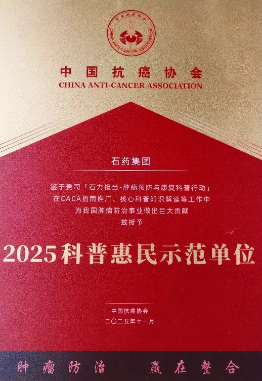 石藥集團(tuán)榮獲中國抗癌協(xié)會“2025年科普惠民示范單位”