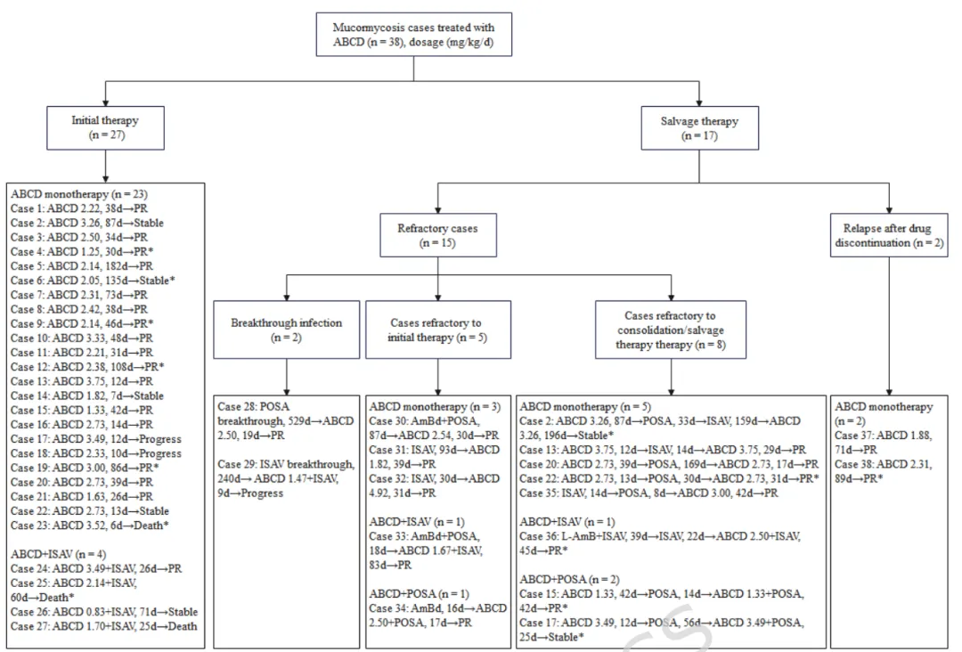 本研究為一項(xiàng)單中心、回顧性、真實(shí)世界研究,納入2021年8月至2024年4月在華山醫(yī)院接受ABCD治療的38例毛霉菌病患者。研究旨在評估長期、低劑量ABCD在初始治療和挽救治療中的療效與安全性,并分析影響90天預(yù)后的因素。