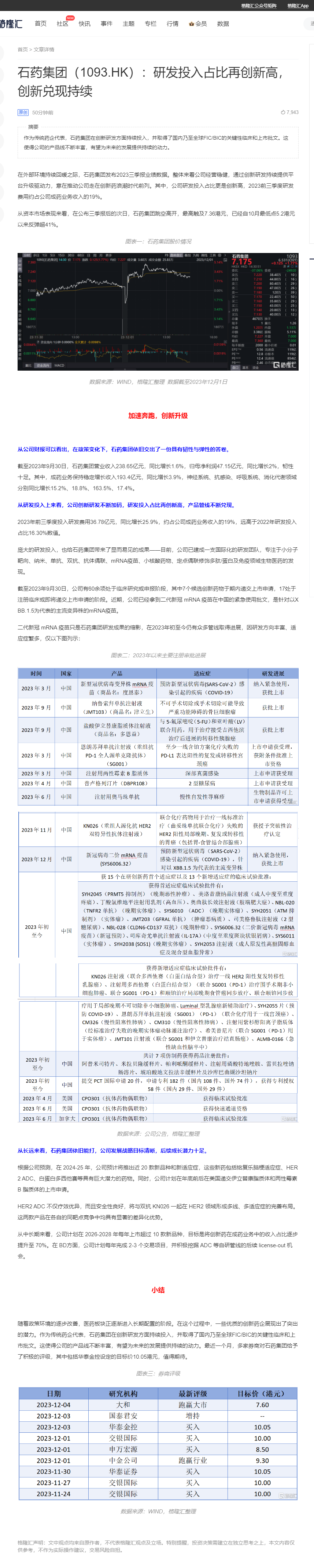 石藥集團(1093.HK):研發(fā)投入占比再創(chuàng)新高,創(chuàng)新兌現持續(xù)