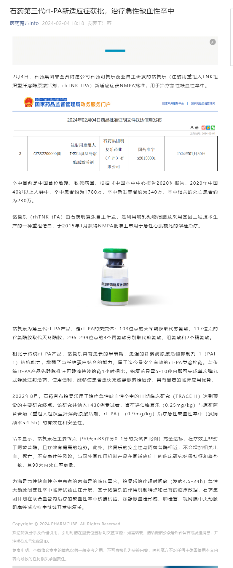 石藥集團(tuán)明復(fù)樂獲批新適應(yīng)癥,用于急性缺血性卒中患者的溶栓治療