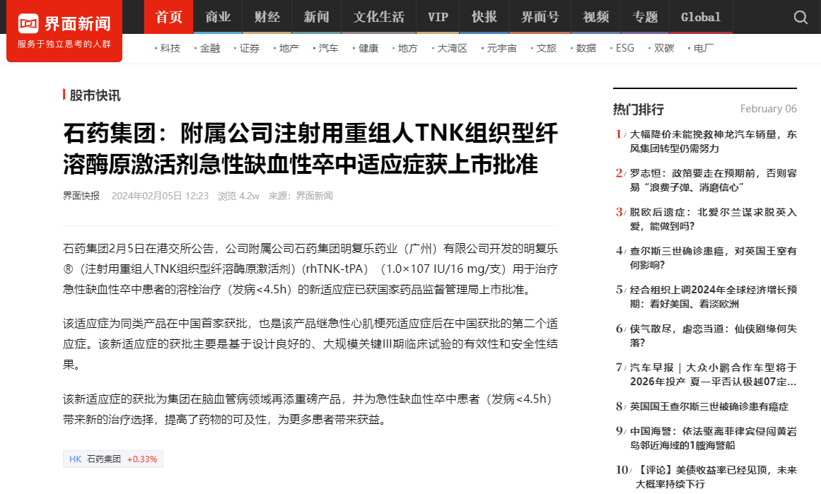 石藥集團明復(fù)樂獲批新適應(yīng)癥,用于急性缺血性卒中患者的溶栓治療
