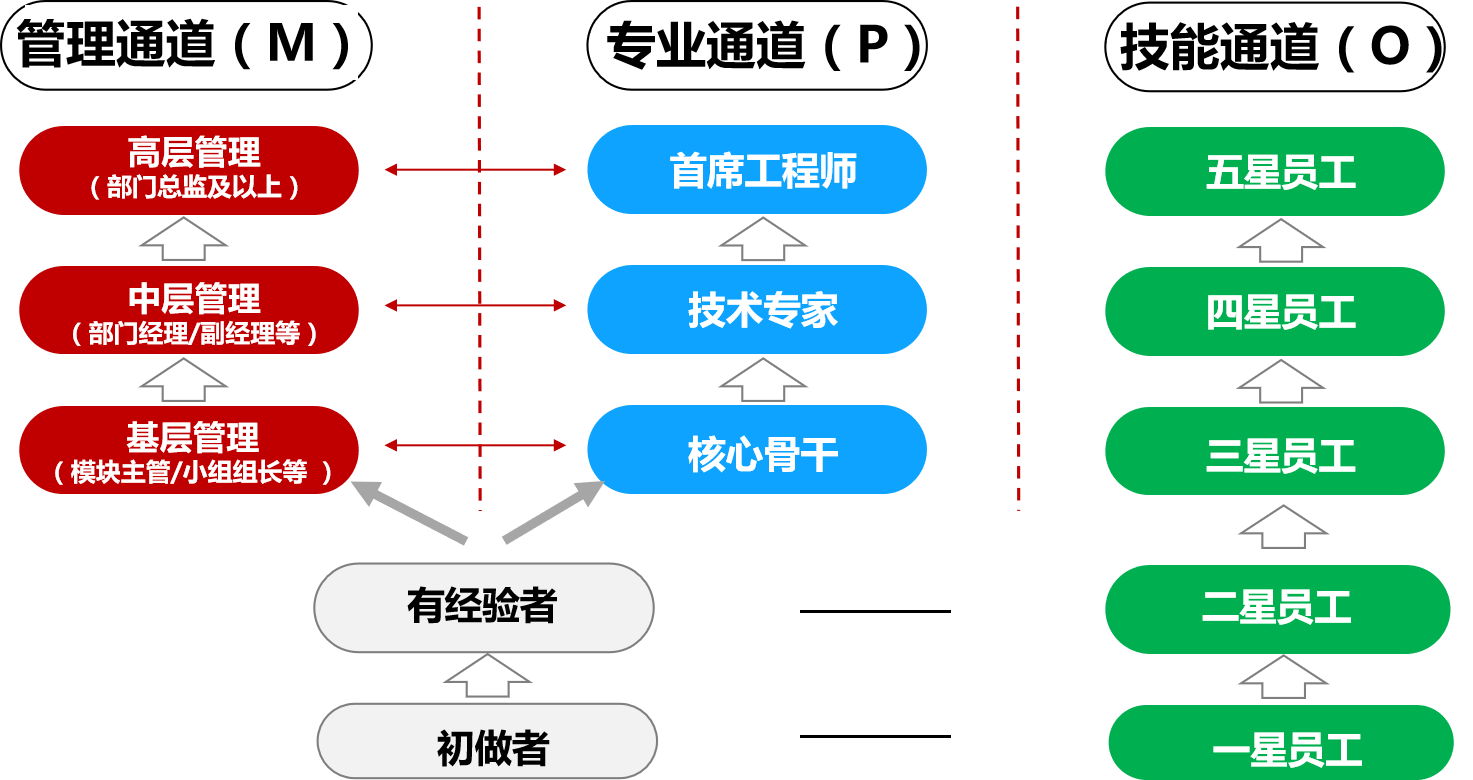 ① 管理通道(M)側重管理能力提升,專業(yè)通道(P)側重技術領域縱深發(fā)展,兩者跨職能、跨領域發(fā)展。